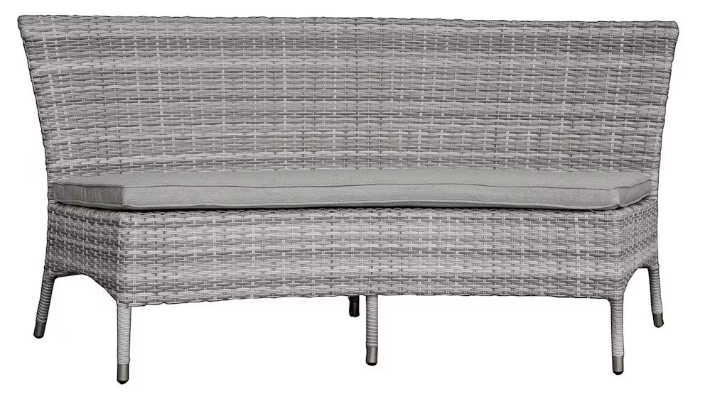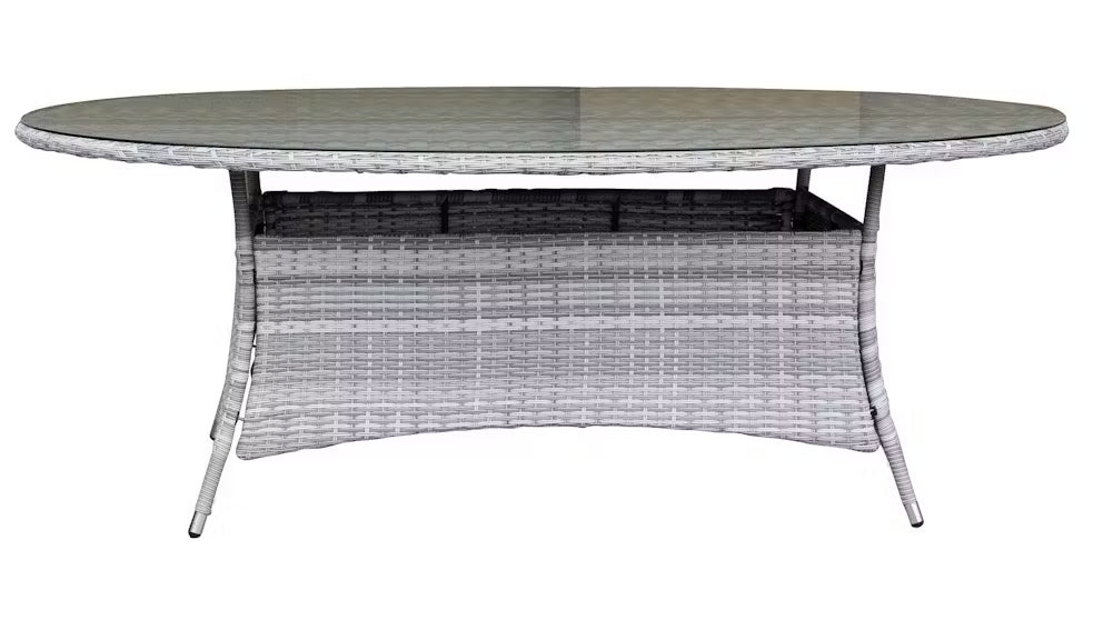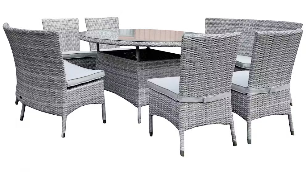 Featuring a tempered glass tabletop, Olefin-upholstered cushions, and foam + fibre filling for lasting comfort. Includes 1 oval table, 4 cushioned chairs, and 2 curved cushioned benches — perfect for family and friends to relax and dine together.