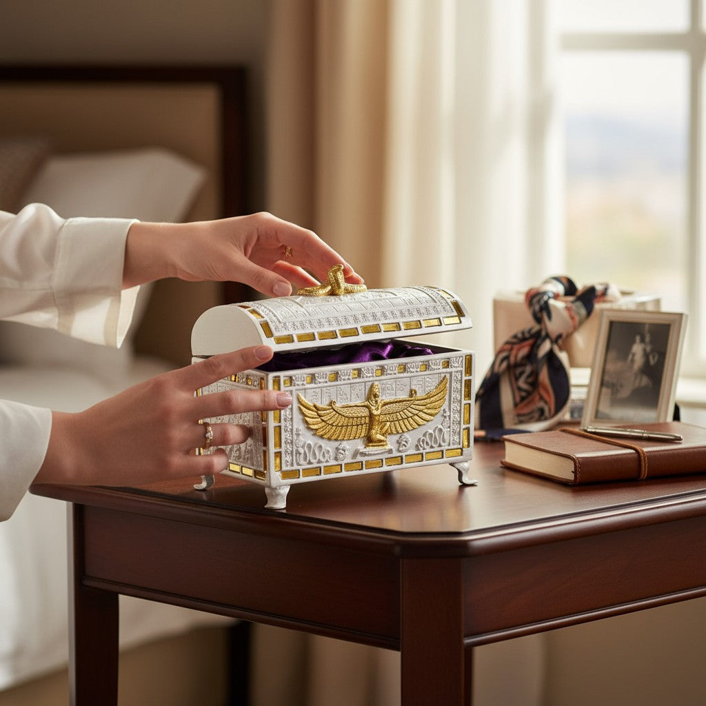 Add a touch of regal charm to your dressing table with the Egyptian Jewellery Box. Adorned in elegant white and gold, this beautifully detailed piece evokes ancient luxury while providing a stylish space to store your treasured accessories. Perfect for adding sophistication to any vanity or bedside. 💎✨