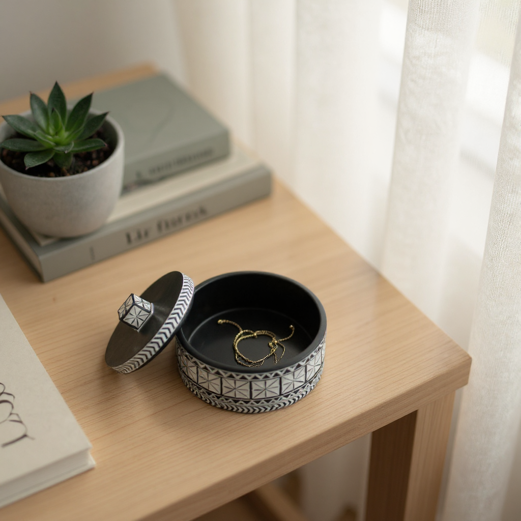 Keep your jewelry and small treasures safe with the Aztec Box. Measuring 12 x 11 cm, this stylish box features striking black and white Aztec symbols that add a bold, cultural touch to your space. Its compact size and unique design make it a cheerful and functional addition to your home.