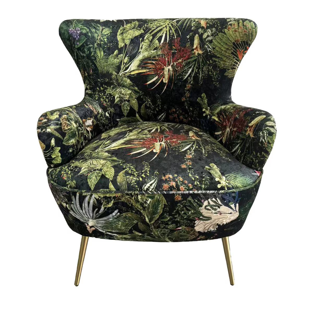 - Upholstery: Printed velvet fabric, rich in texture and design