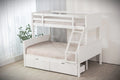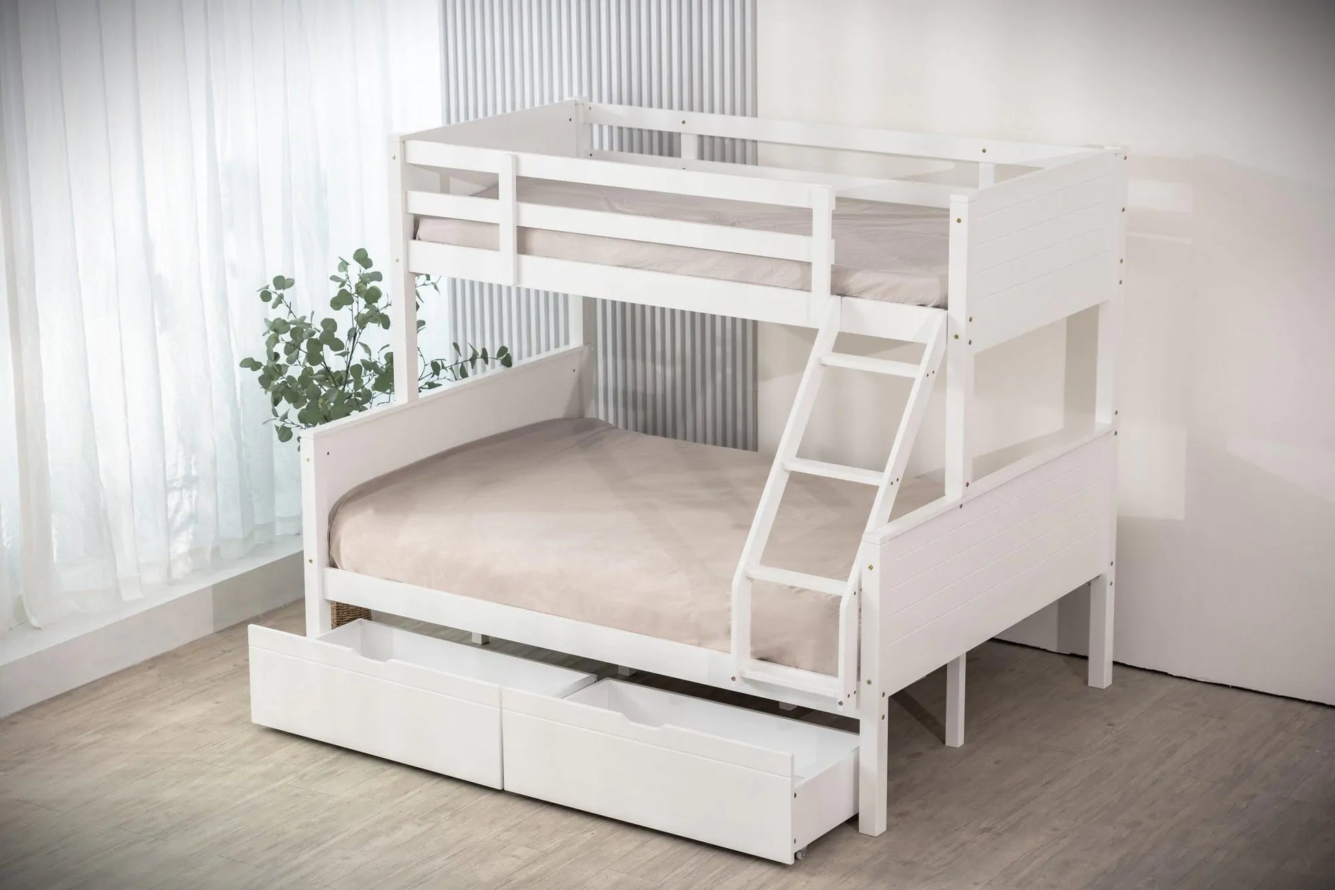 Constructed from solid pine with durable LVL slats, the Luna Bunk Bed ensures long-lasting durability and stability. The fresh white paint finish adds a modern and clean look to any room. For added convenience, the two roomy storage drawers on castors help keep bedding, toys, and personal items organized, minimizing clutter.