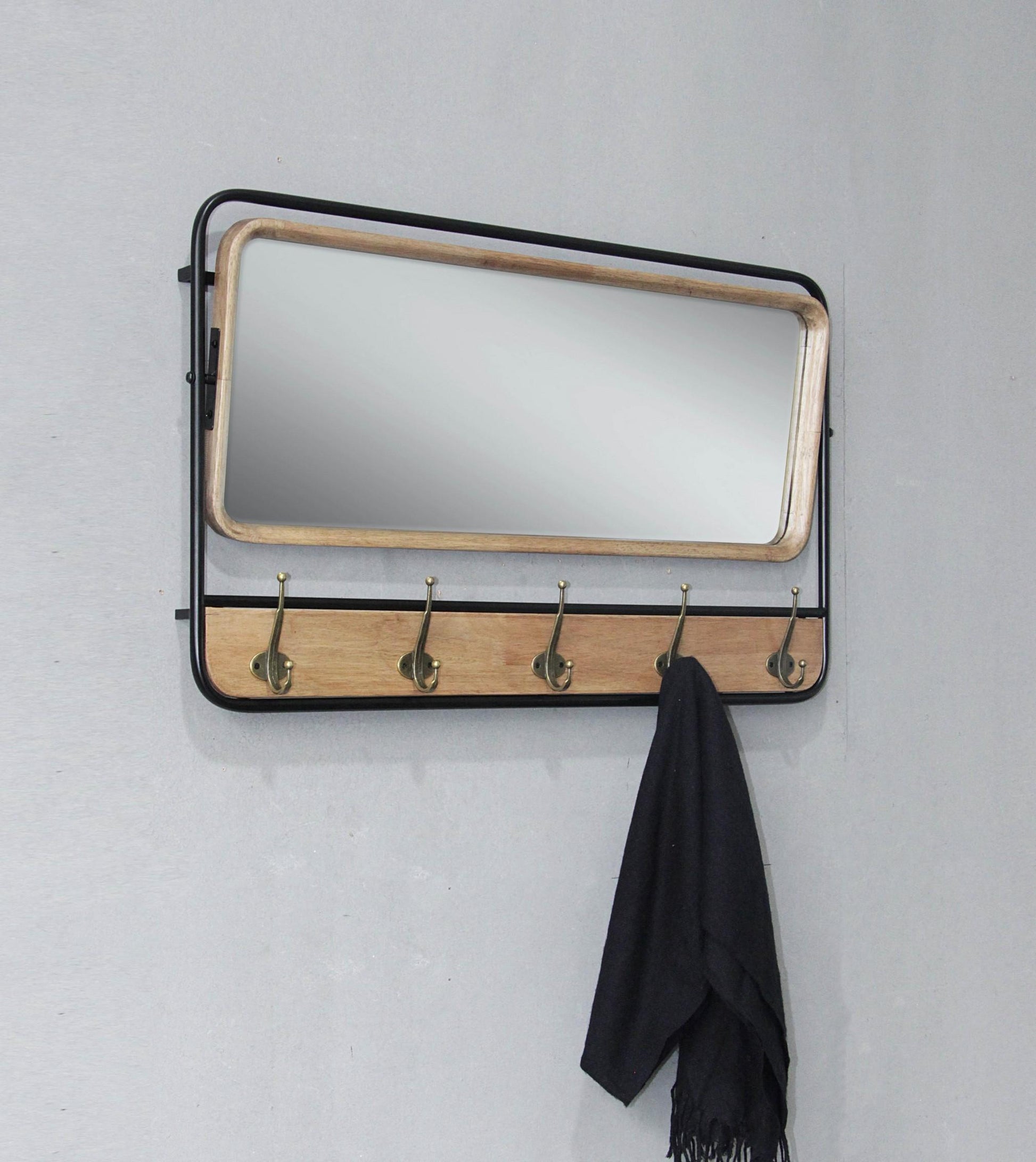 A PRACTICAL AND STYLISH ADDITION TO ANY ENTRYWAY OR HALLWAY, THIS WALL MIRROR COMBINES FUNCTIONALITY WITH ELEGANCE. THE MIRROR IS ACCENTED BY STURDY COAT HOOKS, PROVIDING A CONVENIENT PLACE TO HANG JACKETS, BAGS, OR SCARVES WHILE ADDING DEPTH AND LIGHT TO YOUR SPACE. PERFECT FOR ORGANIZING SMALL SPACES WITH A TOUCH OF CHARM.