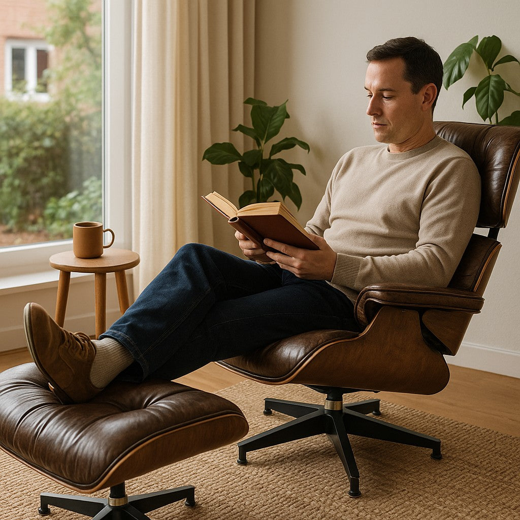 Refined, relaxed, and effortlessly stylish—the Eames Chair & Footstool in Vintage Cigar adds instant sophistication to any living room, study, or entertainment area. With its button-backed design, gently reclined form, and perfectly paired footstool, this duo invites you to unwind in timeless comfort and character.