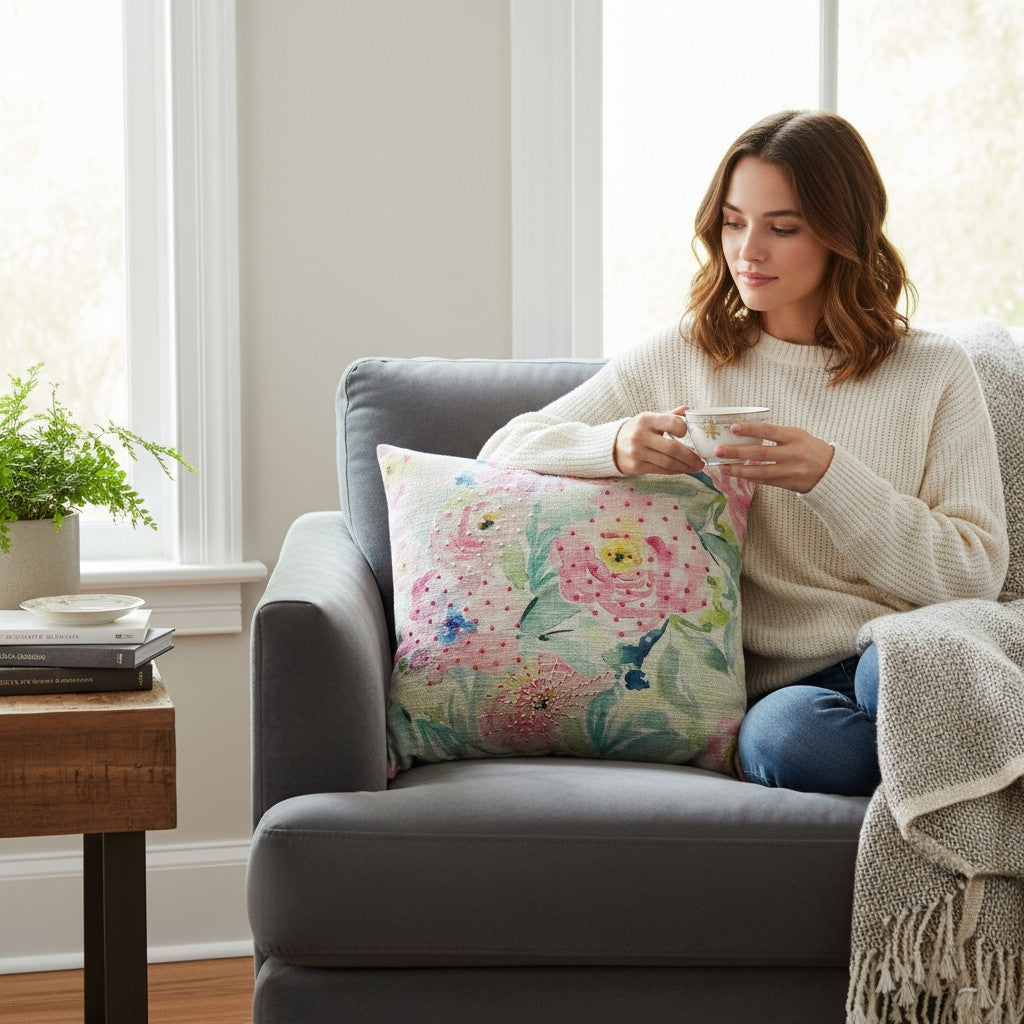 Bring a fresh and elegant touch to your home with the Floral Cushion 3. Crafted from 100% cotton, this soft and breathable cushion features a delicate floral pattern on an ivory base, adding subtle charm and timeless style to any space. Perfect for layering on sofas, armchairs, or beds for a cozy and inviting look. 🌸🪶