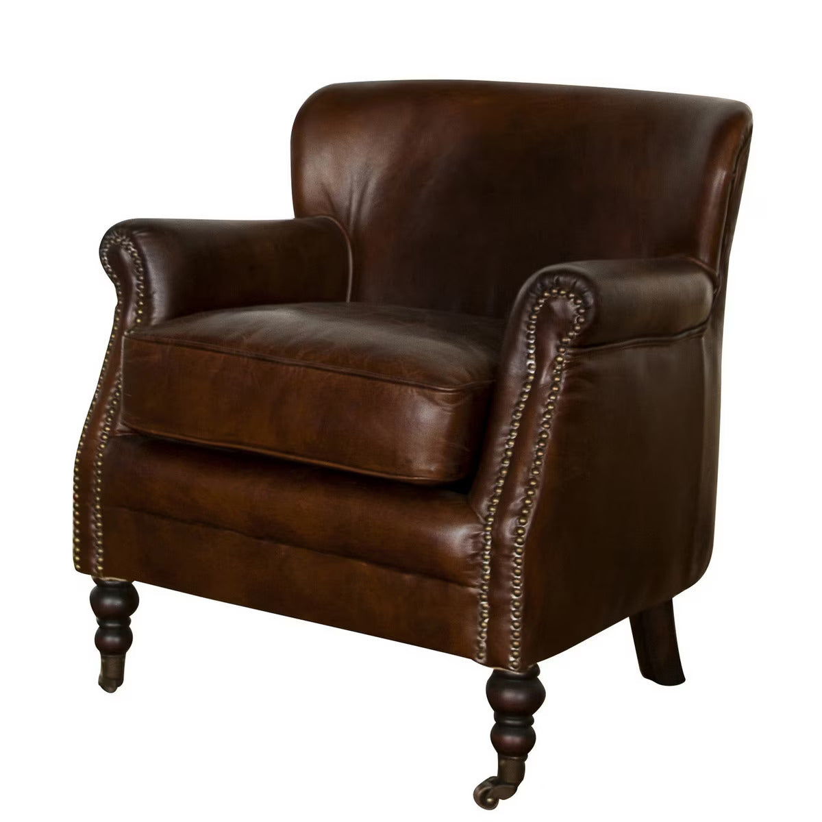 Refined yet full of personality, the Mortimer Armchair is a standout piece for those who appreciate classic comfort with elevated detailing. Upholstered in premium top grain leather and finished with elegant brass nailhead trim, it brings warmth and vintage charm to any lounge, office, or entertainment space.