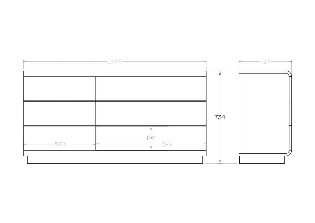 K1306L – 6 Drawer Lowboy (Large): 1445W × 417D × 734H mm