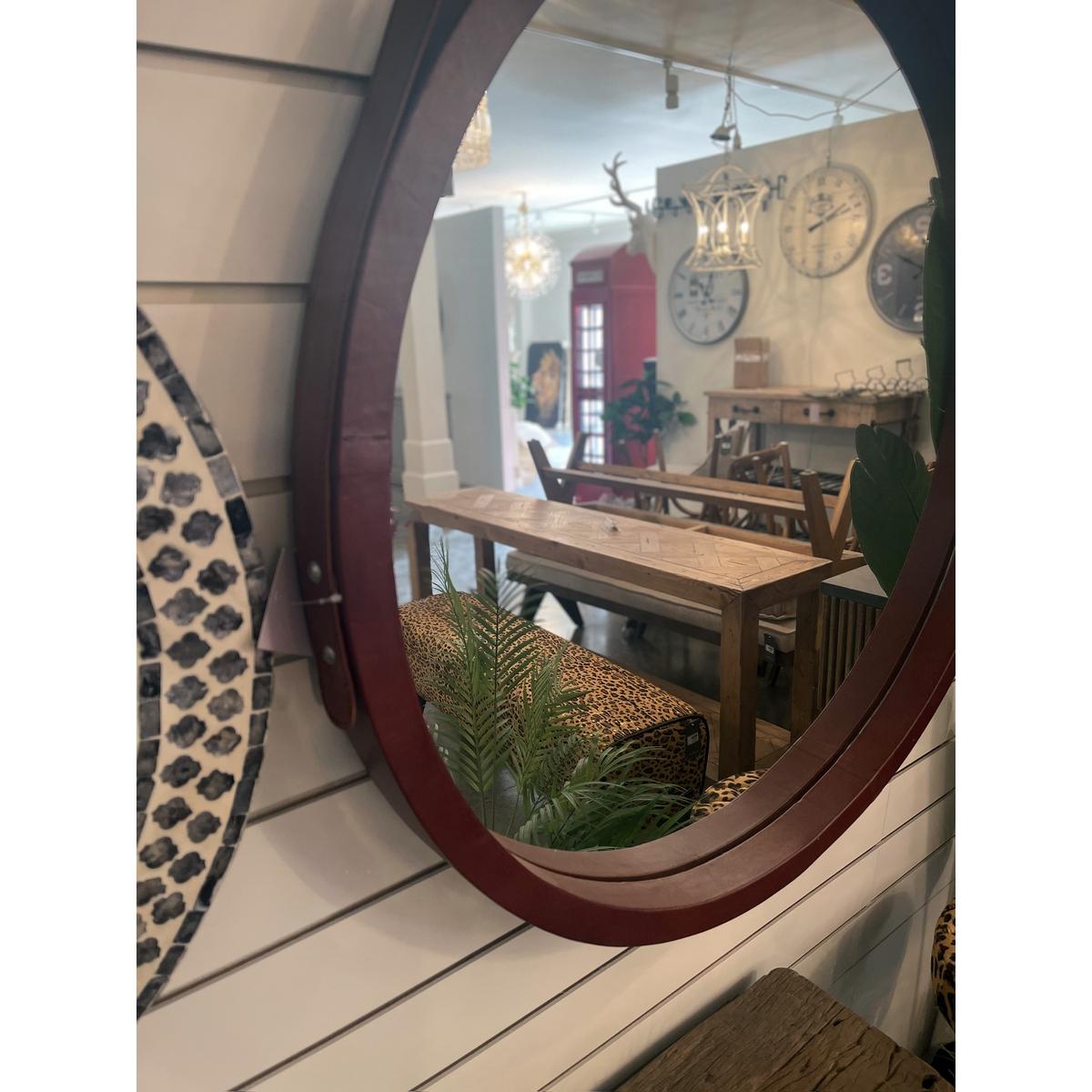 Elegant and antique-inspired, the KC1099 (RFA) Round Leather Mirror adds a touch of rustic charm and earthy texture to any wall space. Featuring a natural leather hanging strap and a solid wood frame, this mirror offers a beautifully balanced design that suits both modern and vintage interiors.