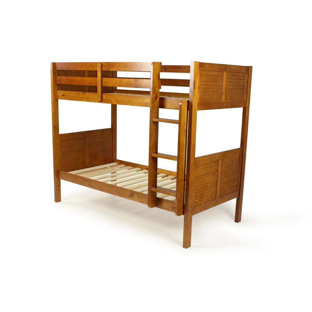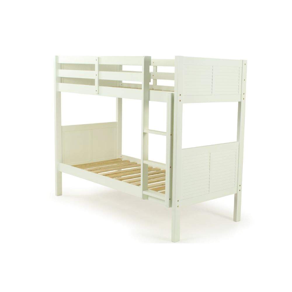 Description The Louvre bunk bed is a great option for childrens' room, it comes in lacquered White or Walnut colour which is suitable for a nice contemporary look or a solid modern look. Built using solid pine it has single base and top which will accomodates 2 children or 2 average size adult comfortably.