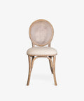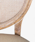 The Maretta Chair showcases elegant French-inspired design, featuring a round rattan backrest and a beautifully studded upholstered base. Crafted from elm wood with a natural rattan insert and a linen-cotton blend seat, this chair exudes timeless sophistication and charm.