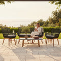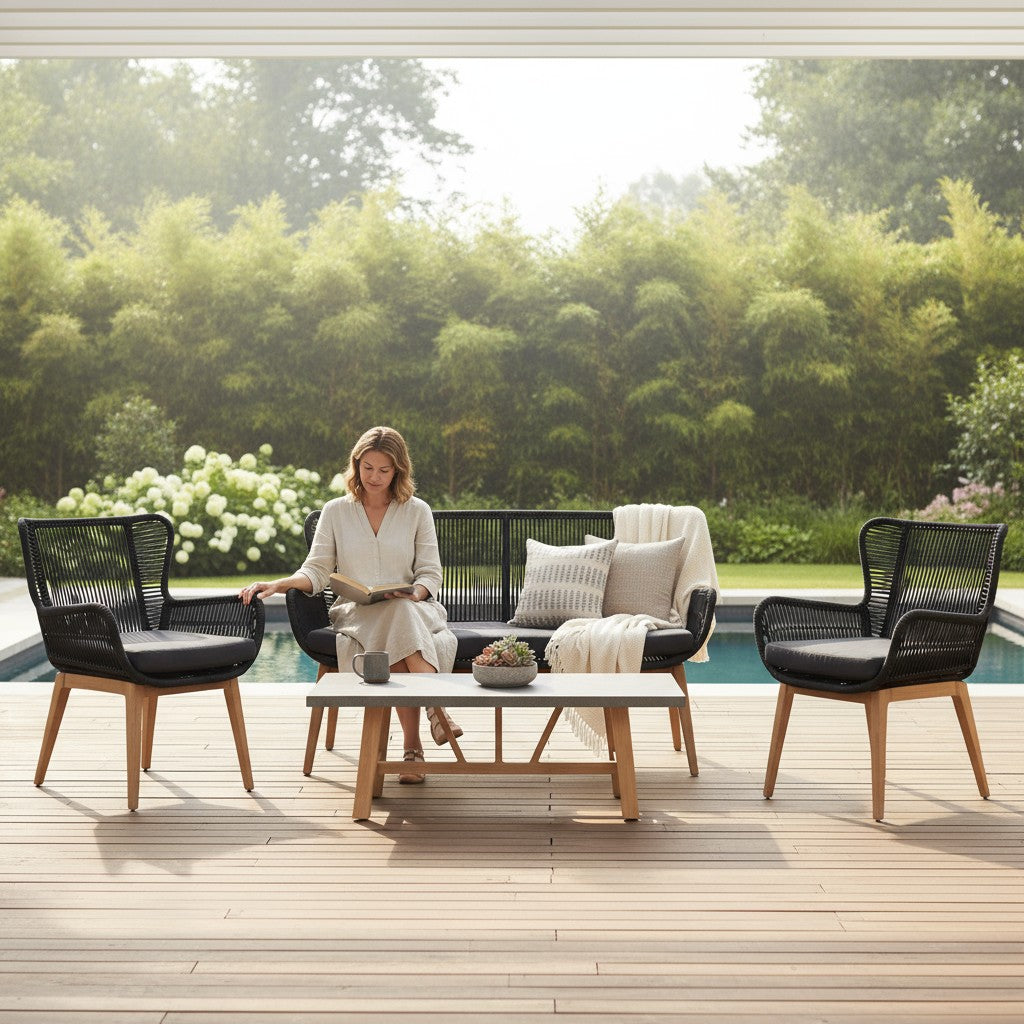 The polycement-top coffee table provides a sleek, low-maintenance surface, while the UV-protected seat and back cushions deliver comfort and protection under the sun. Ideal for partially or fully covered alfresco areas.