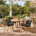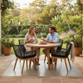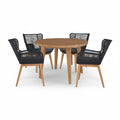 Bring resort-style comfort to your outdoor space with the Marrakesh 5 Piece Round Dining Suite. Beautifully crafted from brushed eucalyptus timber, this set combines natural warmth with contemporary design. The dark grey rope chairs with polyester fabric cushions add a touch of sophistication while ensuring comfort and durability — perfect for relaxed outdoor dining with family or friends.