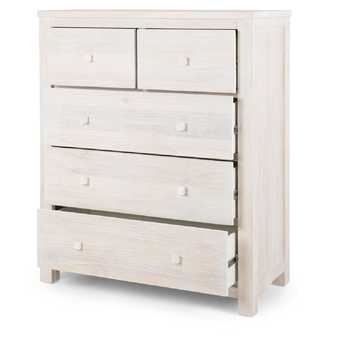 Construction Sandblasted, whitewashed mindi with timber drawer pulls and telescopic runners