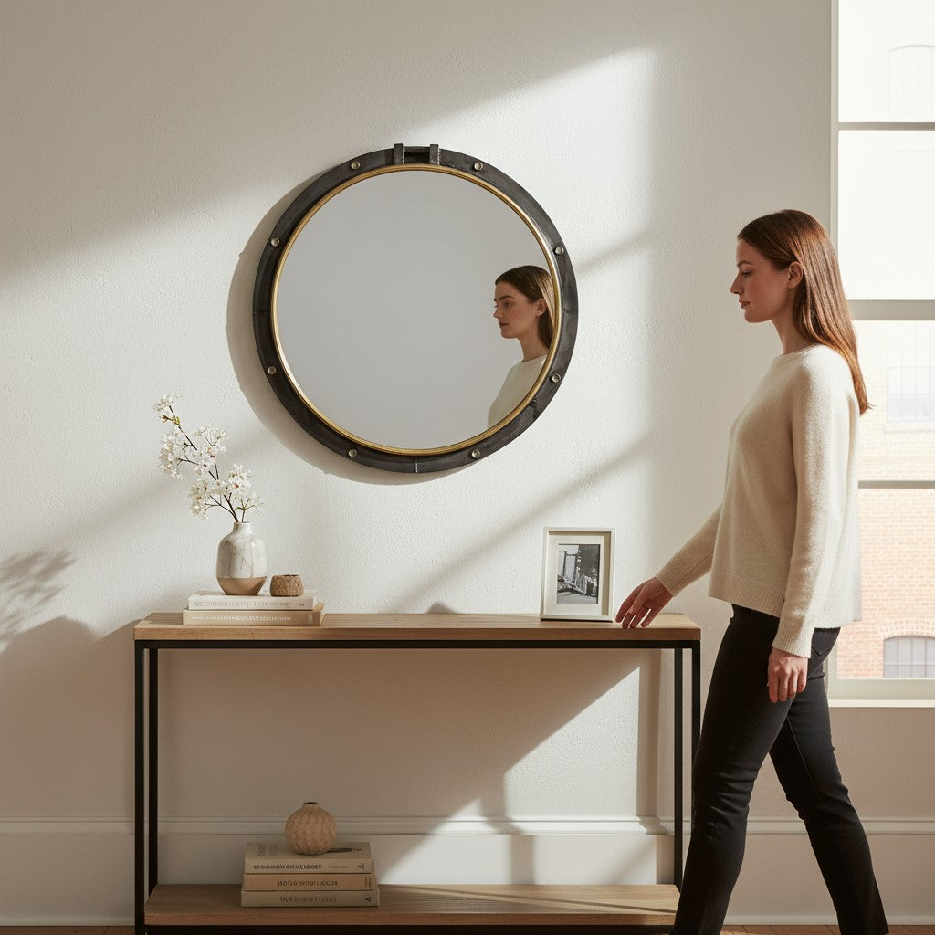 Bring nautical charm to your interior with this port hole inspired mirror. 🌊 Its bold black iron frame adds character and depth, making it a standout feature in hallways, living rooms, or entryways. A timeless accent piece that captures both style and adventure. ✨