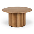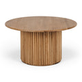A smooth, circular design and slatted pedestal base give this table a modern edge that feels sophisticated yet grounded.