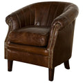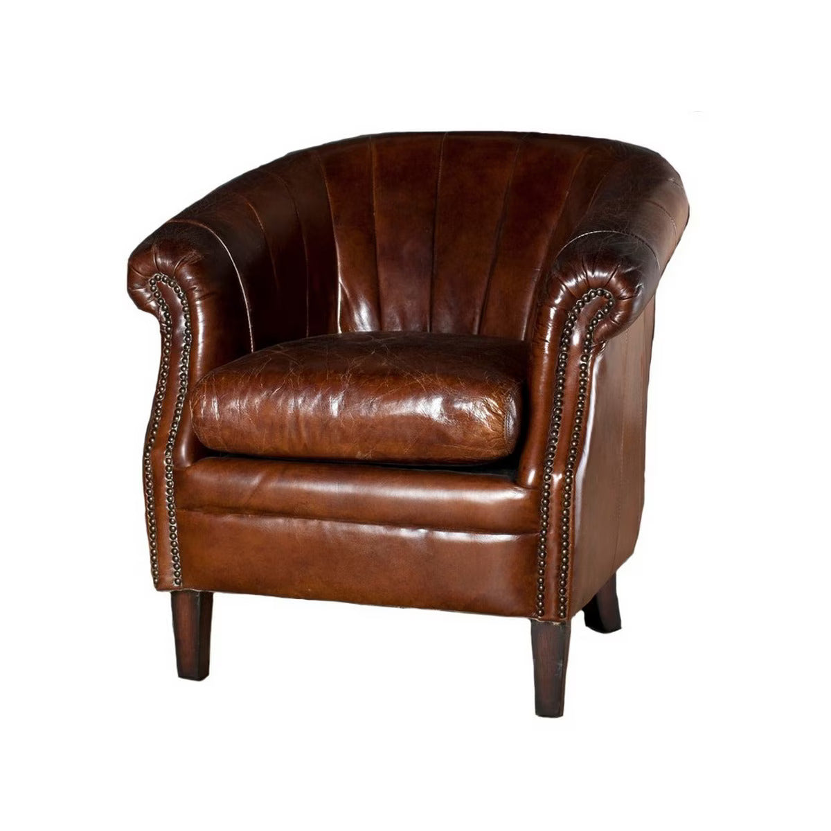 Compact in size yet rich in character, the Roosevelt Tub Chair brings refined charm and timeless appeal to any room. Upholstered in vintage-finished top grain leather with subtle metal accents and brass nailhead detailing, this piece offers a perfect blend of comfort, craftsmanship, and classic styling.