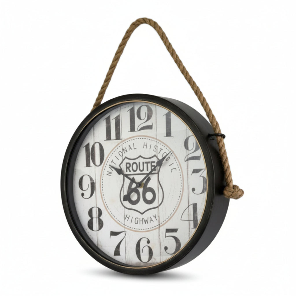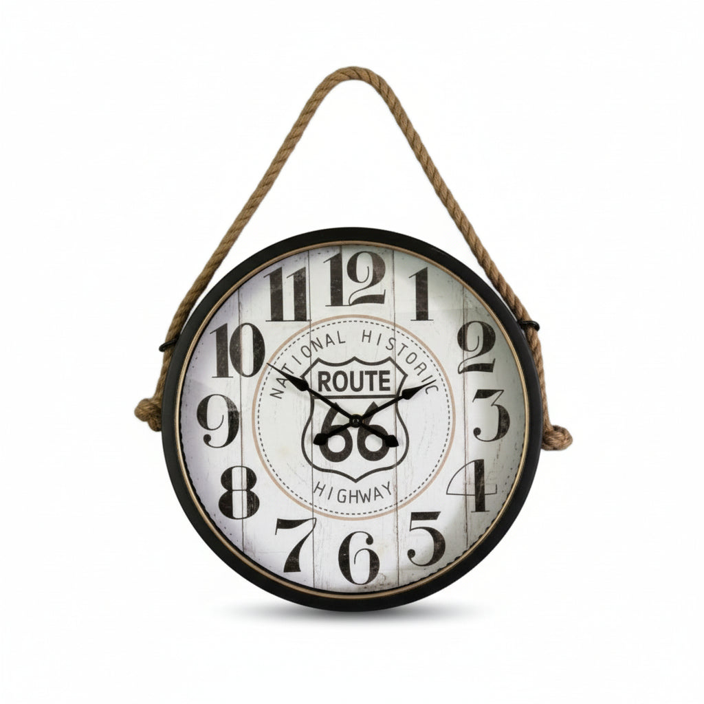 Bring vintage Americana into your space with this striking Route 66 Hanging Clock. Featuring a generous 40cm diameter face, it's bold enough to command attention in any room. The rustic industrial aesthetic is enhanced by sturdy rope detailing, creating an authentic, weathered charm that complements modern and eclectic interiors alike. Perfect for adding character to your kitchen, garage, or living area, this timepiece merges function with nostalgic style. A statement piece that celebrates the open road and timeless design.