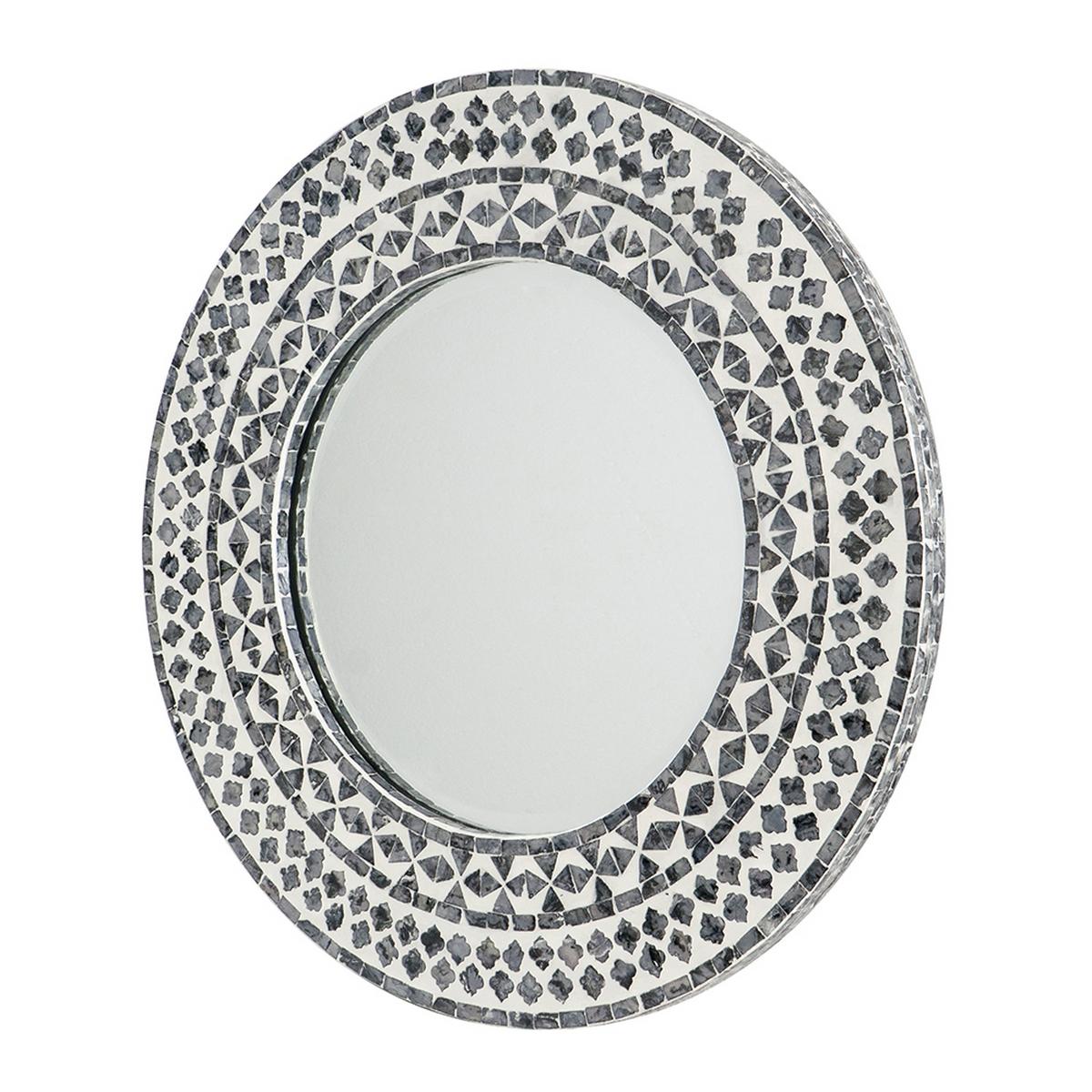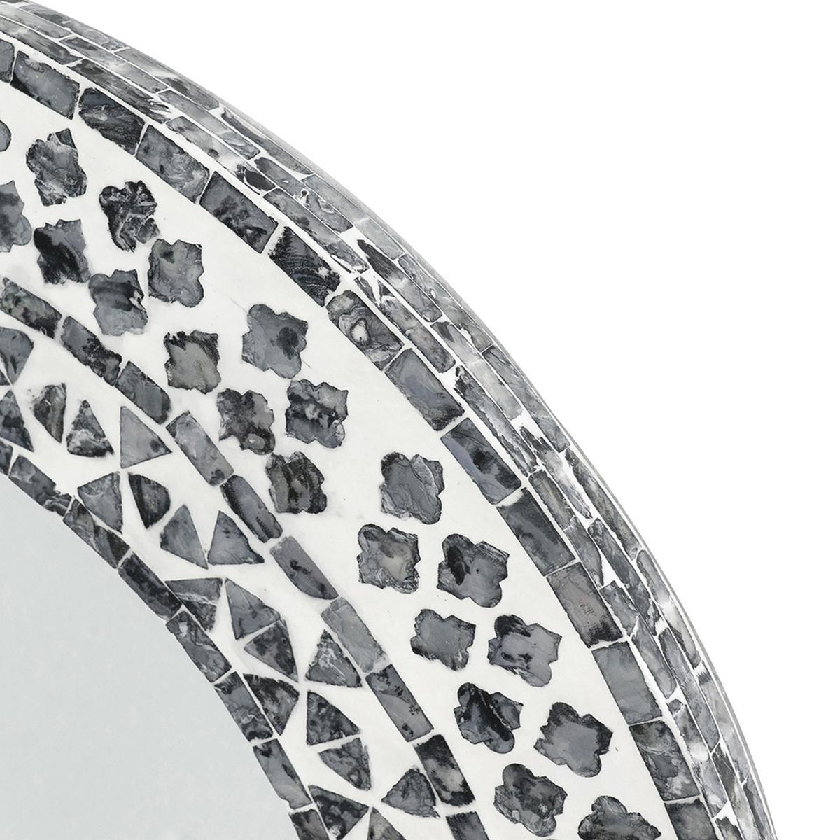 The intricate geometric patterning along the outer frame quietly complements the clean circular form of the mirror, making it a standout decorative piece with everyday practicality.