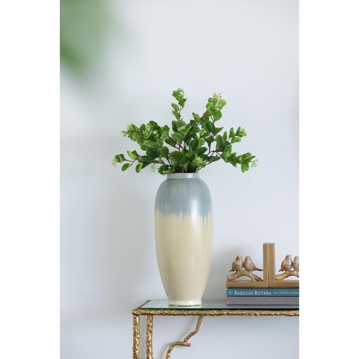 Add subtle grace and color to your room with the Florence ceramic vase. Finished in a beautiful cream and soft blue reactive glaze this vase is an eye-catching accent for any room. On its own or filled with flowers this vases is the perfect way to accent any home or office.