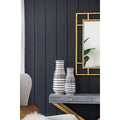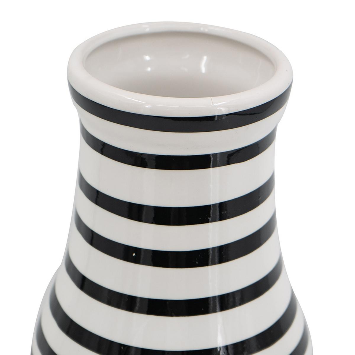 FEATURING A CURVED SHAPE, A CIRCULAR FOOTED BASE, AN OPEN-MOUTH DESIGN, AND A HAND-PAINTED SERIES OF HORIZONTAL BLACK STRIPES, THIS DECORATIVE VASE IS CRAFTED FROM 100% SLEEK, HIGH-QUALITY CERAMIC. AS VERSATILE AS IT IS CHARMING, THIS PIECE COULD BE DISPLAYED EMPTY AS A DECORATIVE ACCENT OR FILLED WITH A CUSTOM ARRANGEMENT OF FLOWERS OR BRANCHES.