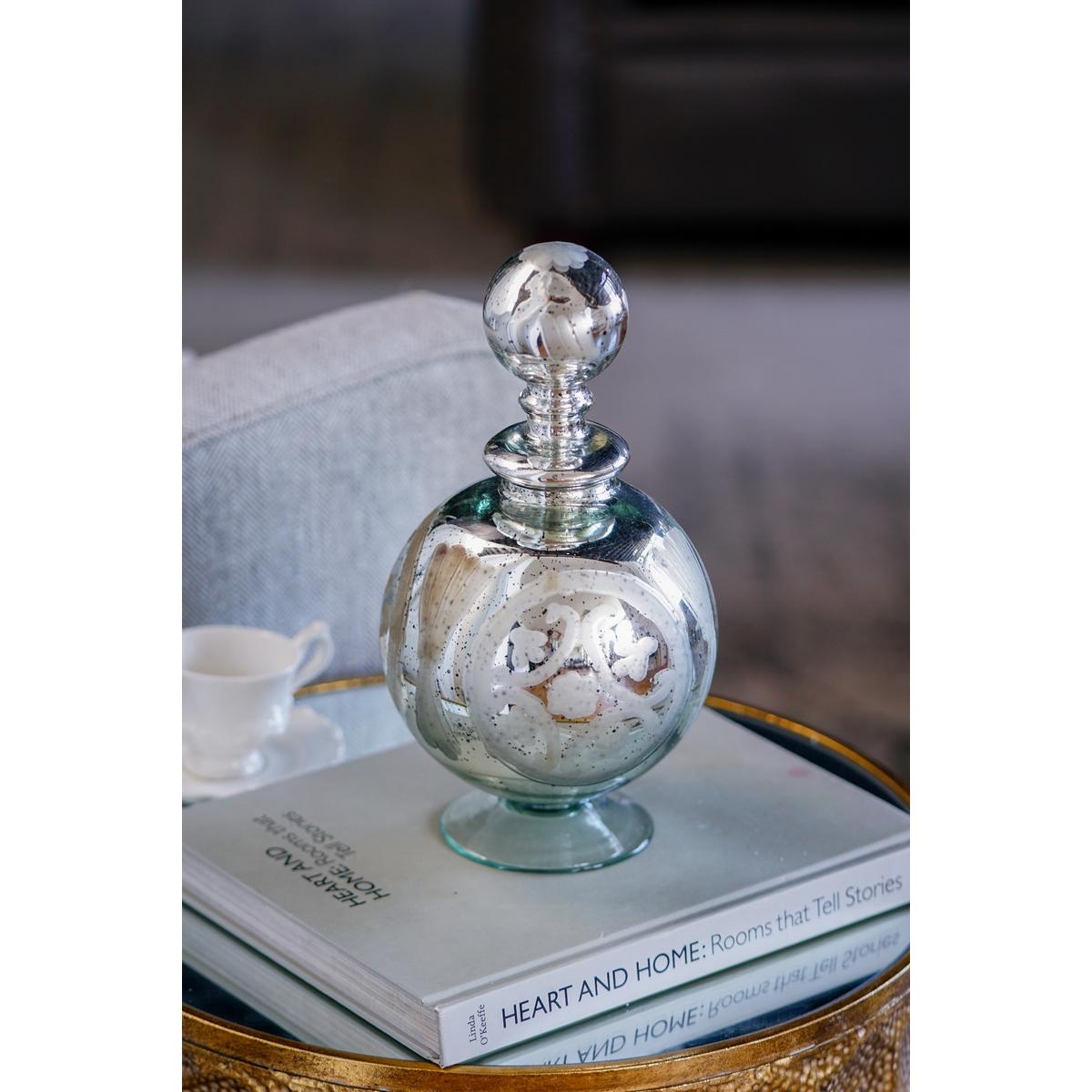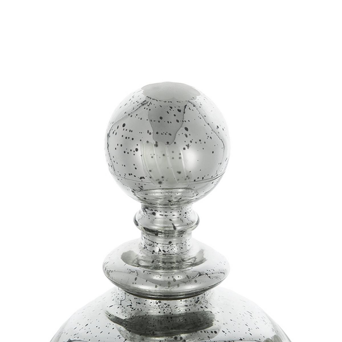 FEATURING AN IRREGULAR ROUNDED SHAPE REMINISCENT OF A PERFUME BOTTLE, THIS APOTHECARY JAR IS CRAFTED FROM 100% GLASS AND FINISHED WITH A COAT OF ANTIQUE SILVER. MEASURING AT 150x280mm, IT IS THE PERFECT SIZE FOR YOUR CONSOLE TABLE, MANTEL, SHELVING UNIT OR ANYWHERE IN NEED OF A VINTAGE TOUCH. TO COMPLETE THE SOPHISTICATED VISUALS, THE SURFACE OF THE JAR SHOWCASES A HAND ETCHED NOVELTY PATTERN.