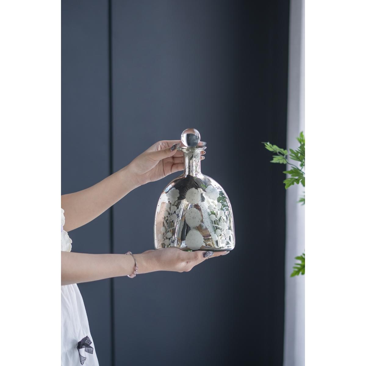 FEATURING A WIDE, CURVED SILHOUETTE, SHORT NARROW NECK AND SPHERICAL STOPPER, THIS JAR IS CRAFTED FROM 100% GLASS AND FINISHED WITH A COAT OF ANTIQUE SILVER. THE ETCHED PATTERNS WHICH ACCENT THE SURFACE ADD ANOTHER LAYER OF INTRIGUE TO THE DISPLAY, WHETHER IT IS ON SHOW ON YOUR TABLETOP, MANTEL, SHELVING UNIT OR ANYWHERE IN YOUR HOME IN NEED OF A VINTAGE TOUCH.