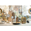 THE RADIANT GOLD FINISH GLEAMS WITH A LUSTROUS APPEAL, CREATING A CAPTIVATING FOCAL POINT ON ANY WALL OR SHELF. THE CLOCK FACE, EMBELLISHED WITH GRACEFUL NUMERALS OR MARKERS, ADDS FUNCTIONALITY TO ITS CHIC AESTHETIC.