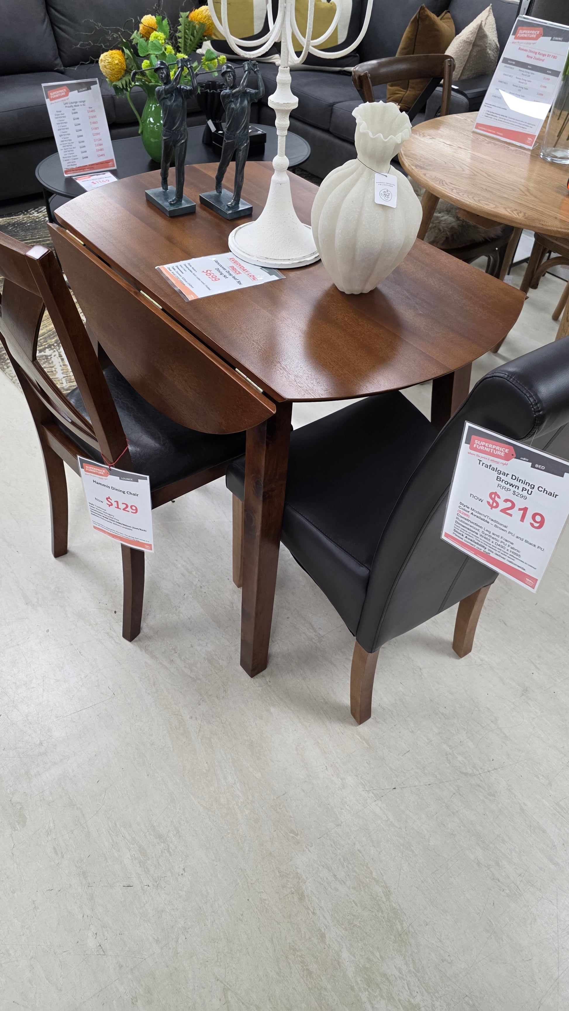 The Vancouver Dining Table includes two practical drop-leaf sides, making it a brilliant space-saving solution for apartments, studios, and smaller dining areas. When fully opened, it comfortably seats up to four with the matching Cross-Back Hammis Chairs, giving you a functional and stylish dining setup.