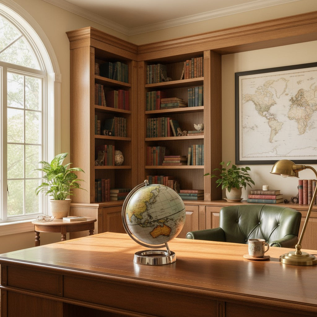 Brighten up any space with this modern world globe featuring a sleek chrome halo pedestal. Standing 34cm high and 24cm wide, it’s perfect for a kid’s room, study, or office. Its unique design adds a fresh, stylish touch while inspiring curiosity and learning. A charming and functional addition to your decor.